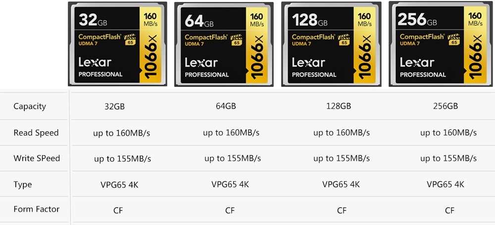 Compact Flash CF 160 mo VPG65 4K, Full HD, vidéo CF1066X